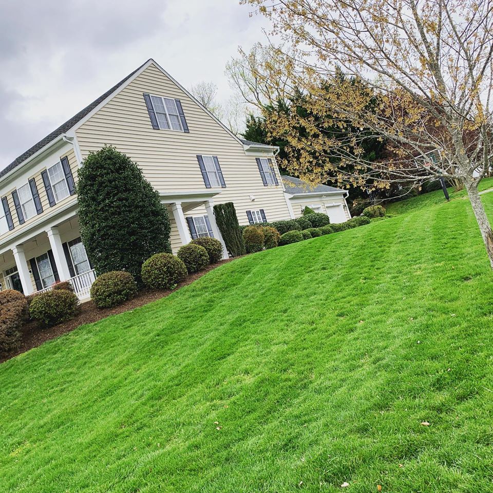 In most cases, we are mowing cool season turf, primarily Tall Fescue. For most of the year, we will be mowing at 4 inches. We do this for a few reasons. First, we never want to mow more than the top one-third of the grass. This prevents “scalping”, which can be a quick path to disease and burnout. Second, mowing at a taller height will allow the blades to provide shade, keeping it healthy and cool during the warm months. Simply put, mowing at 3.5-4″ is the ideal height for your Tall Fescue Lawn.